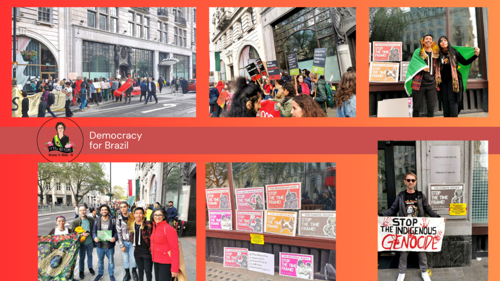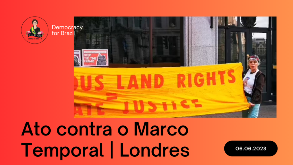 O Coletivo Democracy for Brazil/UK juntamente com Amazon Rebellion e BrazilMatters realizaram o Ato STOP BRAZILIAN POLITICIANS STEALING INDIGENOUS LAND. SAY NO TO THE BILL 490! A manifestação aconteceu na terça-feira (6 de junho de 2023), na frente da embaixada do Brasil em Londres.