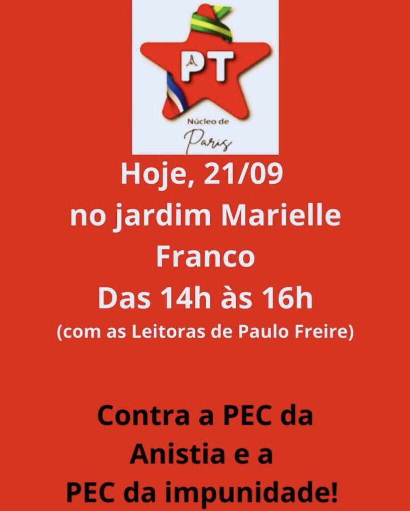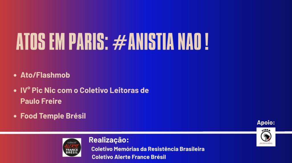 O Coletivo Memórias da Resistência Brasileira na França 2016-2023 e Alerte France Brésil convidam a todos os brasileiros e brasileiras de Paris e região a se juntarem ao povo que estará nas ruas do Brasil nesse domingo 21 de setembro, para participar do Ato/Flashmob #Anistia Não ! FIM DA ESCALA 6 x1 Isenção do IR e TAXAÇÃO dos SUPER RICOS.