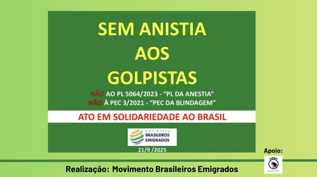 Brasileiras e brasileiros dentro e fora do país se unem em um ato em defesa da Democracia e da Justiça. Nós, que vivemos em outros países, acompanhamos com atenção e preocupação os rumos do Brasil. A democracia conquistada com tanto esforço e sacrifício não pode ser negociada nem relativizada. O ato de 21 de setembro é um chamado à consciência coletiva: solidariedade ao Brasil, resistência contra retrocessos e compromisso com a verdade e a Justiça.