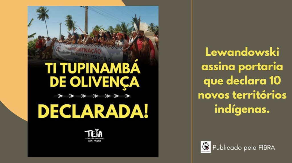 No dia dos Povos Indígenas na COP30 em Belém, o ministro Lewandowski assinou a portaria que declara 10 novos territórios indígenas: Vista Alegre (AM), Tupinambá de Olivença (BA), Comexatibá (BA), Ypoí Triunfo ( MS), Sair Ba’pim ( PA), Pankará da Serra do Arapuá ( PE), Sambaqui ( PR), Ka’aguy Hovy (SP), Pakurity (SP), Ka’aguy Mirim ( SP).