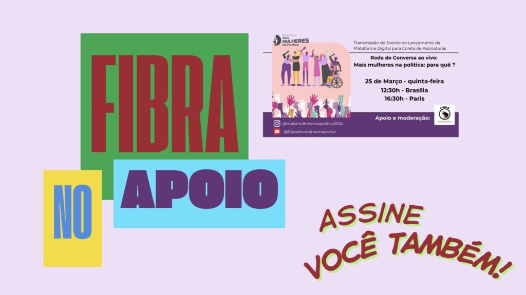 A FIBRA em Paris se fez representar nesta quarta-feira 25 de março do lançamento de uma plataforma para coleta de assinaturas em apoio ao Projeto de Lei de Iniciativa Popular MAIS MULHERES NA POLITICA. Nosso canal do You Tube transmitiu a realização de uma Roda de Conversa virtual com mulheres que lideram o Projeto de Lei de Iniciativa Popular Mais Mulheres na Política, iniciativa que propõe paridade de gênero e raça nos parlamentos brasileiros com reserva de 50% das cadeiras para mulheres, em todas as instâncias legislativas sendo 25% para mulheres negras.