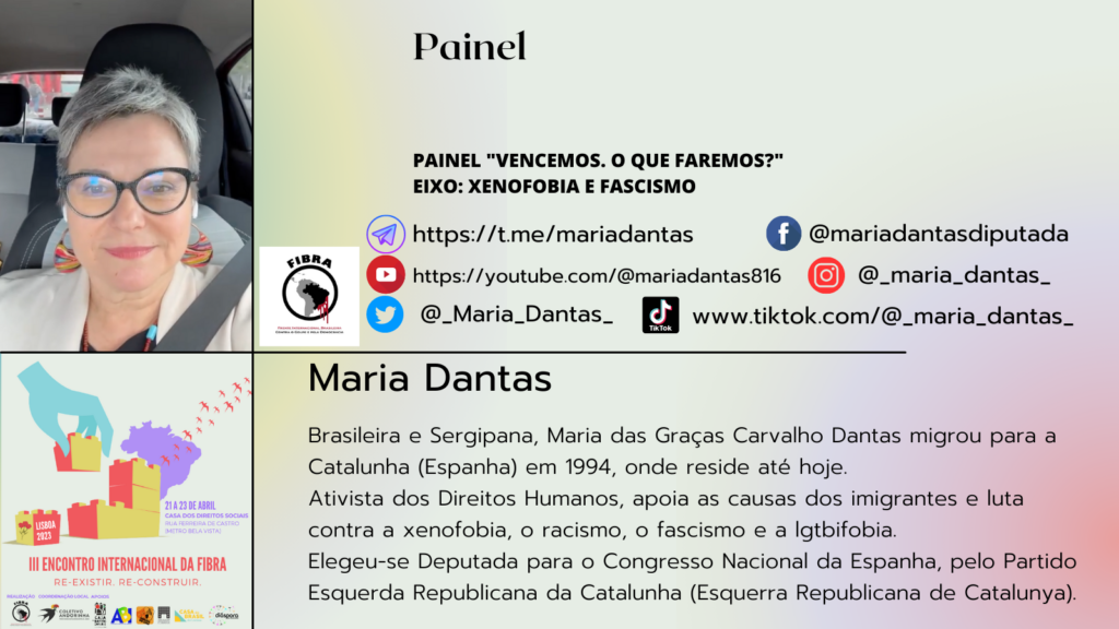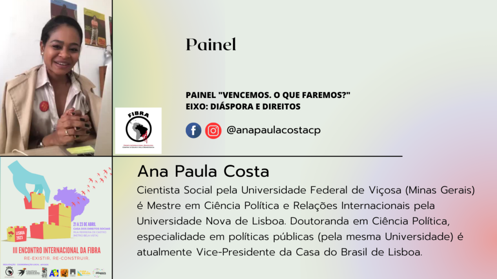 – Painelistas: Ana Paula Costa (tema: Diáspora e Direitos); Maria Dantas (tema: Xenofobia e Fascismo); Grupo Projetemos (“Projetemos no Exterior: estratégia e novas mídias na articulação ativista.”)