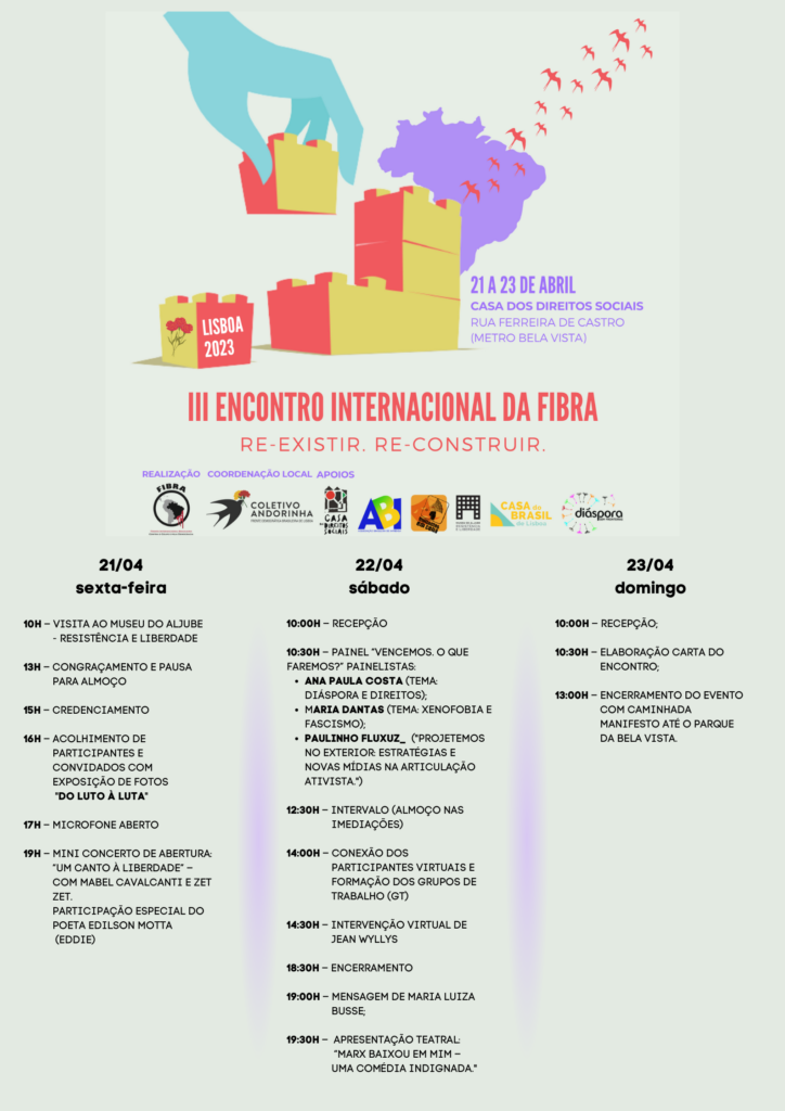O Encontro de Lisboa terá duração de três dias consecutivos: 21/04 (sexta-feira), 22/04 (sábado) e 23/04 (domingo) e reunirá tanto presencialmente, como on-line, ativistas brasileiros integrantes de coletivos, grupos e associações de vários países, bem como membros independentes da FIBRA.