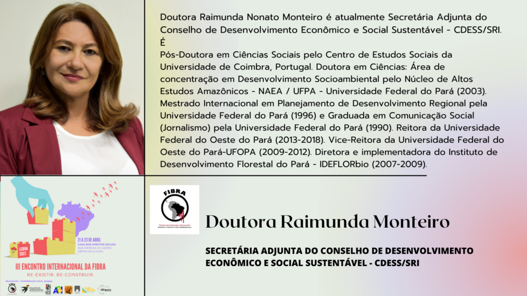 Doutora Raimunda Nonato Monteiro é atualmente Secretária Adjunta do Conselho de Desenvolvimento Econômico e Social Sustentável – CDESS/SRI. É Pós-Doutora em Ciências Sociais pelo Centro de Estudos Sociais da Universidade de Coimbra, Portugal. Doutora em Ciências: Área de concentração em Desenvolvimento Socioambiental pelo Núcleo de Altos Estudos Amazônicos – NAEA / UFPA – Universidade Federal do Pará (2003). Mestrado Internacional em Planejamento de Desenvolvimento Regional pela Universidade Federal do Pará (1996) e Graduada em Comunicação Social (Jornalismo) pela Universidade Federal do Pará (1990). Reitora da Universidade Federal do Oeste do Pará (2013-2018). Vice-Reitora da Universidade Federal do Oeste do Pará-UFOPA (2009-2012). Diretora e implementadora do Instituto de Desenvolvimento Florestal do Pará – IDEFLORbio (2007-2009).