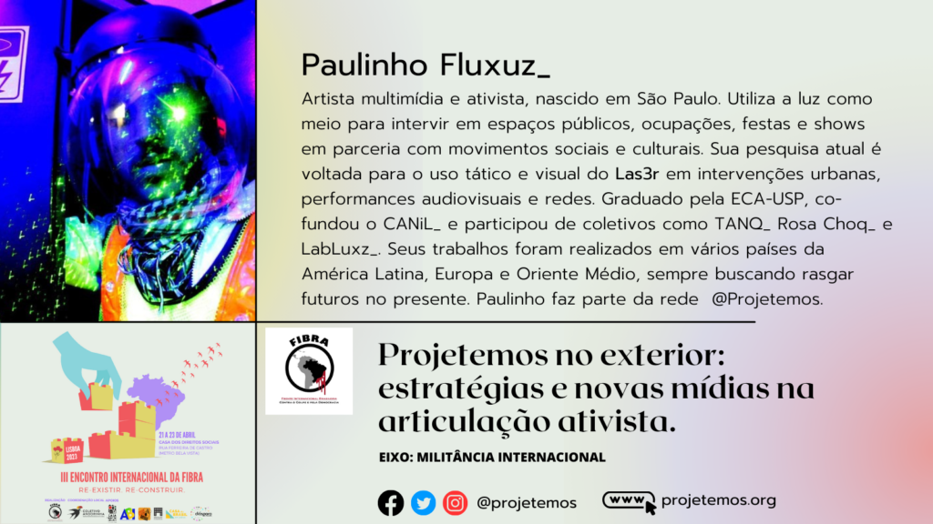 Artista multimídia e ativista, nascido em São Paulo faz parte da rede @Projetemos. Utiliza a luz como meio para intervir em espaços públicos, ocupações, festas e shows em parceria com movimentos sociais e culturais. Sua pesquisa atual é voltada para o uso tático e visual do Las3r em intervenções urbanas, performances audiovisuais e redes. Graduado pela ECA-USP, co-fundou o CANiL_ e participou de coletivos como TANQ_ Rosa Choq_ e LabLuxz_. Seus trabalhos foram realizados em vários países da América Latina, Europa e Oriente Médio, sempre buscando rasgar futuros no presente. Paulinho
